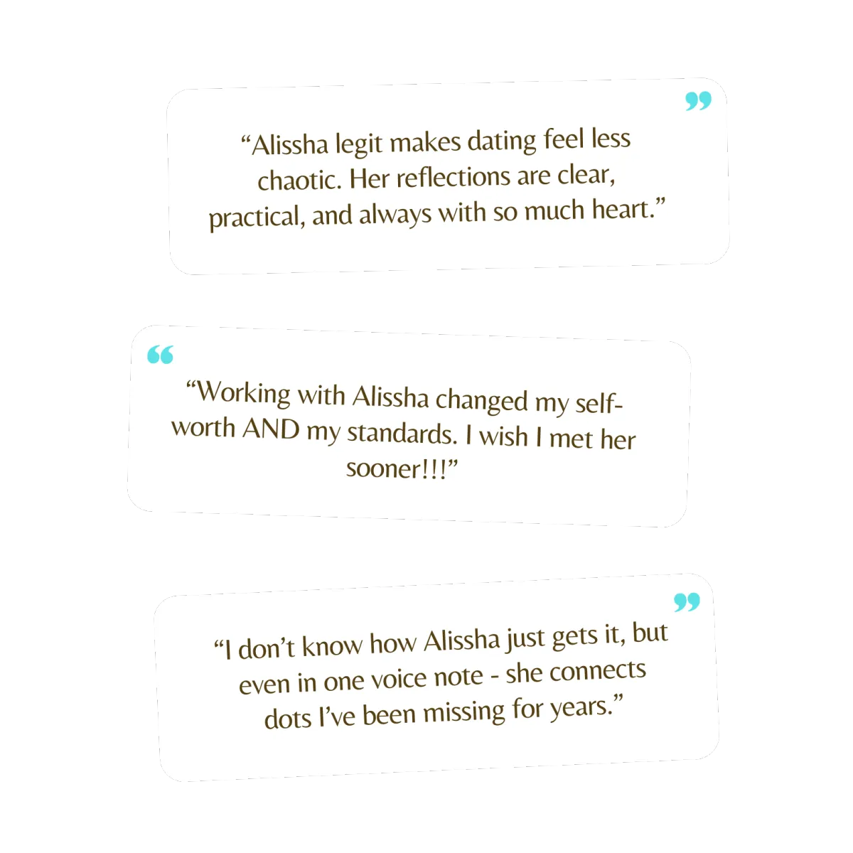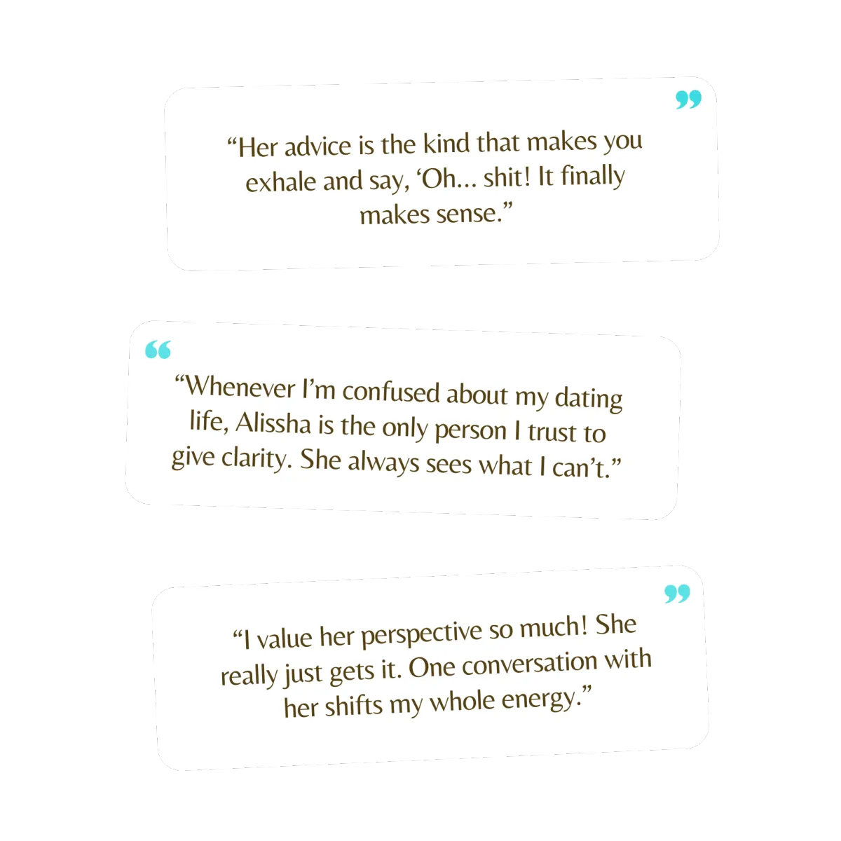 Alissha is always smiling and effortlessly brings people together. I admire her passion, her deep empathy, and the way she shows up so fully for the people in her life. Whether it’s around dating, emotions, or just real connection, she creates space that feels safe, open, and real. I’ve seen her growth up close, and I’m so proud to have received her support.